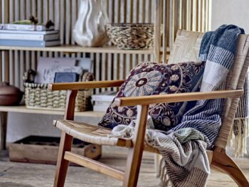 er vævet i genbrugsbomuld med et fantastisk farvespil af brune, grønne, blå og sorte nuancer.